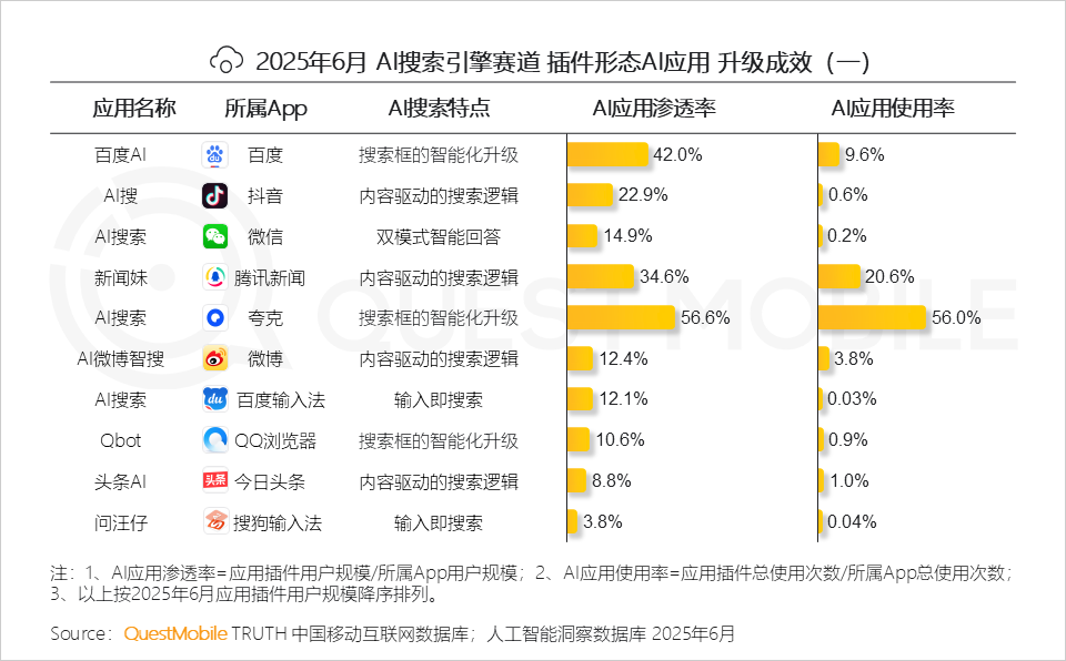 QuestMobile数据显示,2025年5月,DeepSeek App流失用户中,56.0%使用了百度,42.1%使用了QQ浏览器,39.4%使用了豆包。