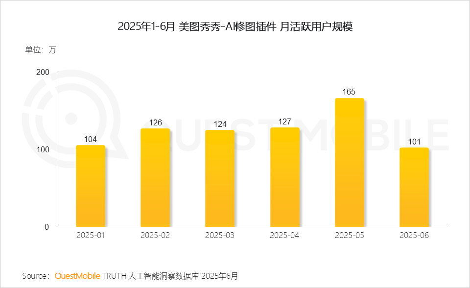 QuestMobile数据显示,2025年6月,美图秀秀旗下AI产品-AI修图月活跃用户规模为100.9万,较1月略微有所下滑。