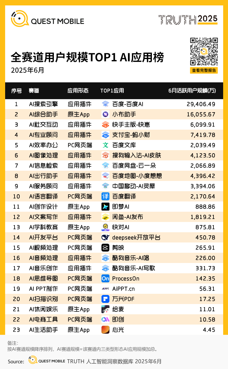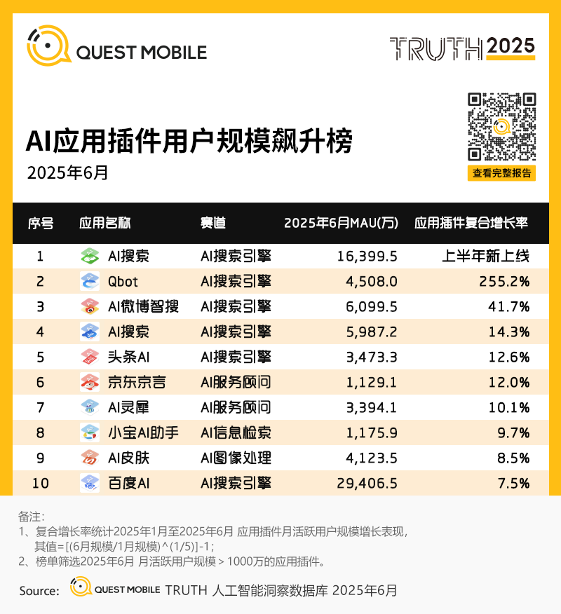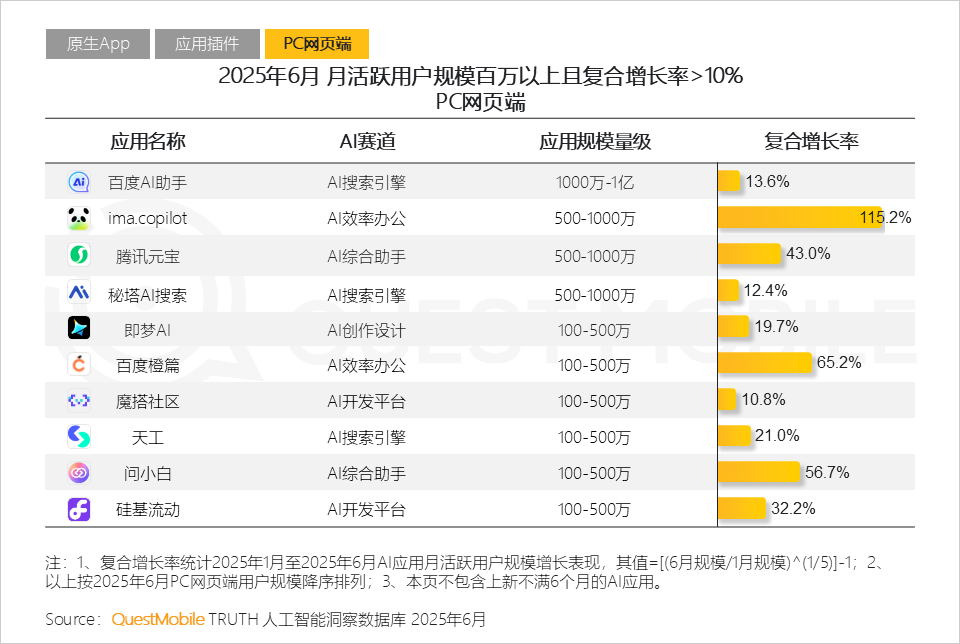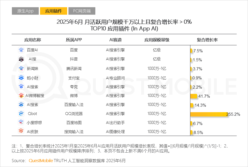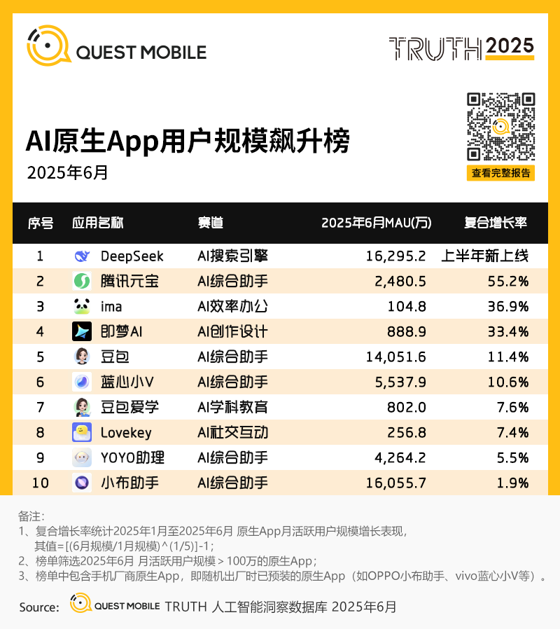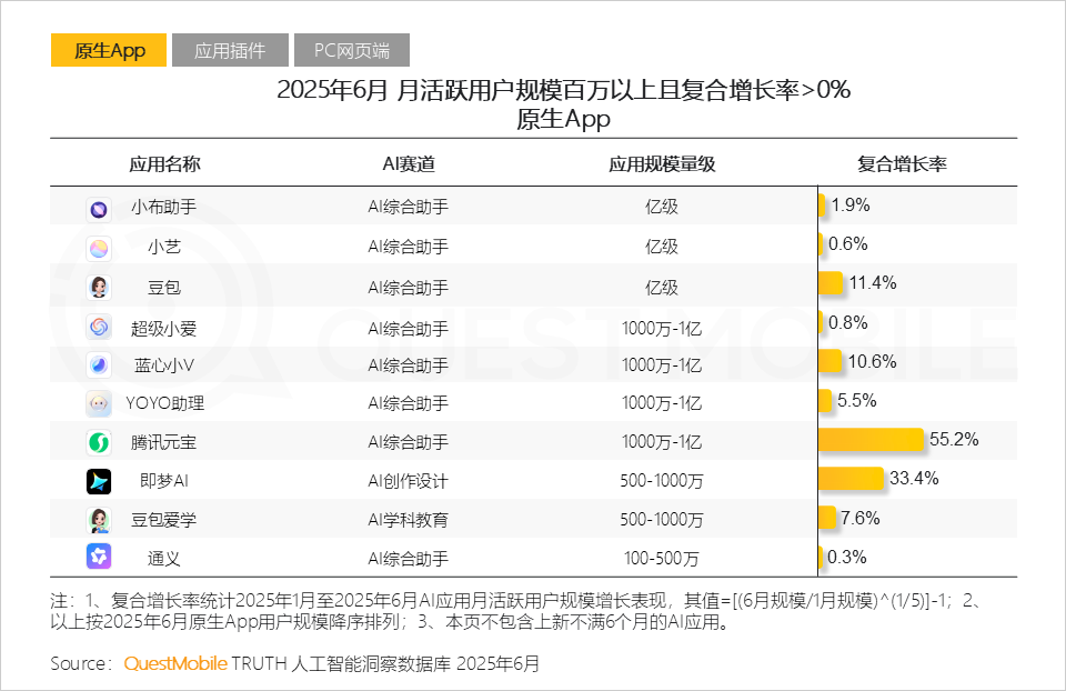 QuestMobile数据显示,腾讯元宝App上半年复合增长率为55.2%,抖音即梦AI达33.4%。