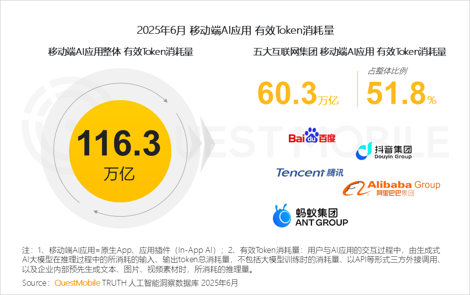 5、与移动端6.8亿用户规模对应的是,有效Token消耗量上升至116.3万亿,其中五大互联网集团占总消耗量的51.8%,达60.3万亿