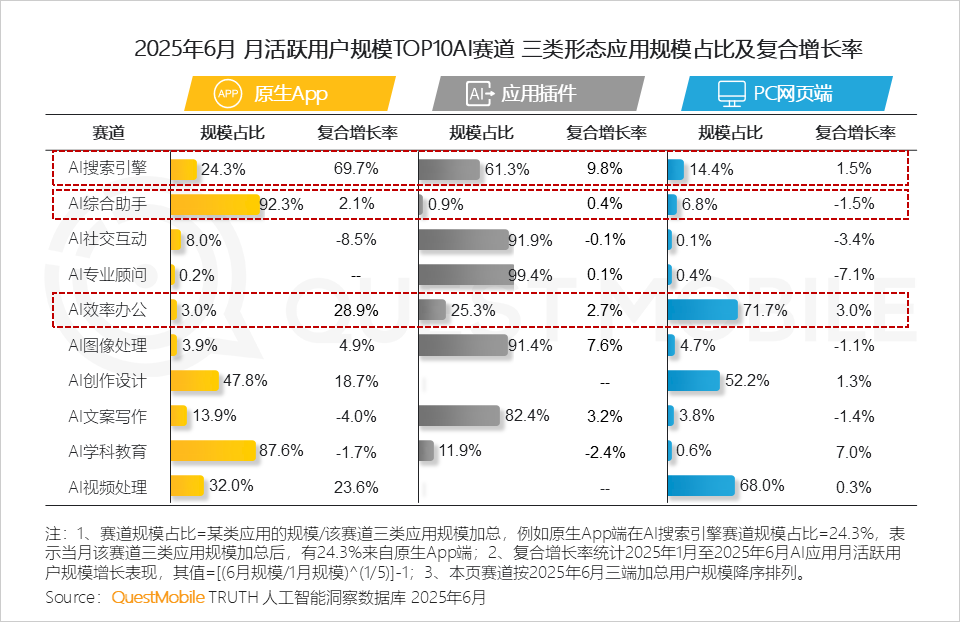 1、上半年AI搜索赛道持续结构性增长;综合助手赛道由手机厂商及头部互联网原生应用垄断,但出现规模与增速倒挂现象;效率办公印证PC端生产力复兴趋势