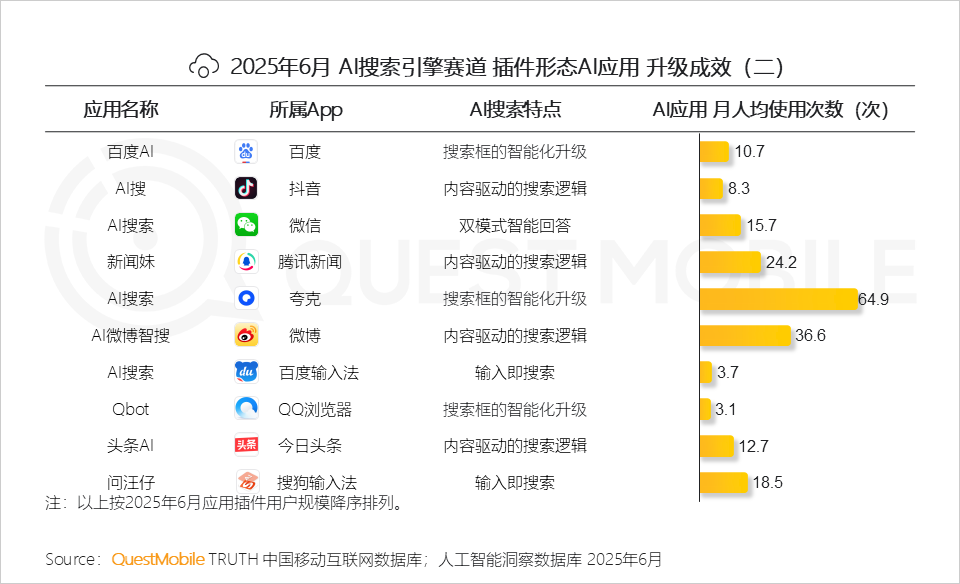 5、月人均使用次数则直接代表用户对AI产品的使用粘性;夸克自搜索框升级后,成效凸显;同属内容驱动的微博、腾讯新闻均找到了特定场景下的搜索驱动微博以泛娱乐类资讯,腾讯新闻以体育类资讯提升用户AI搜索频次。