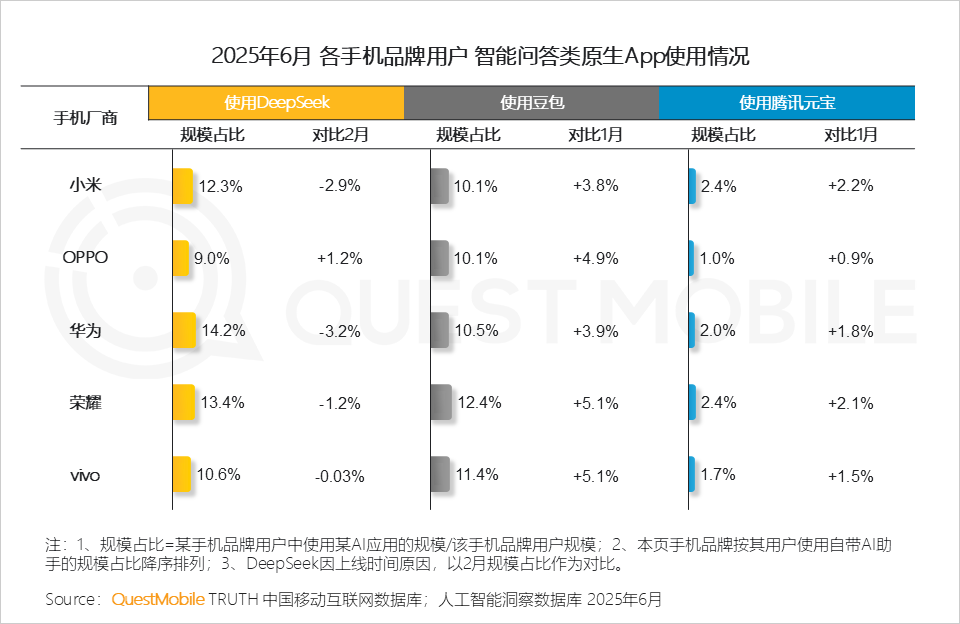 3、QuestMobile数据显示,DeepSeek和豆包在不同手机品牌用户中渗透率突破10%;豆包的多模态创作+多垂类场景覆盖可能会分流手机厂商的AI助手对用户的“吸引力”(智能问答方面)
