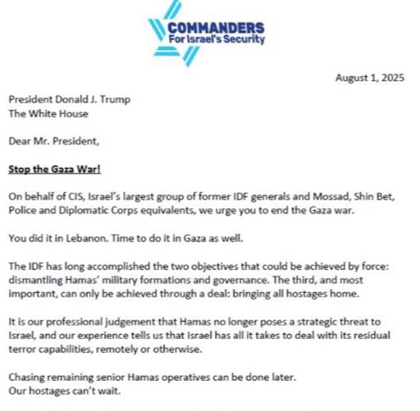 公开信于当地时间8月1日提交给特朗普,4日由以色列前安全官员组织“以色列安全指挥官联盟”公布在社交媒体上。