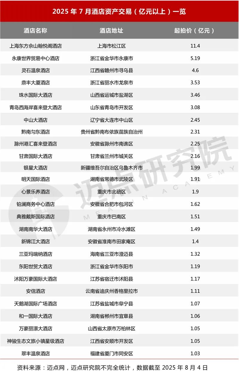 据迈点研究院不完全统计,2025年7月,共有75家酒店拍卖,其中拍卖价格在亿元以上酒店26家,拍卖价格在5000万元-1亿元酒店13家,拍卖价格5000万元以下36家,统计周期内共有5家酒店项目成交。
