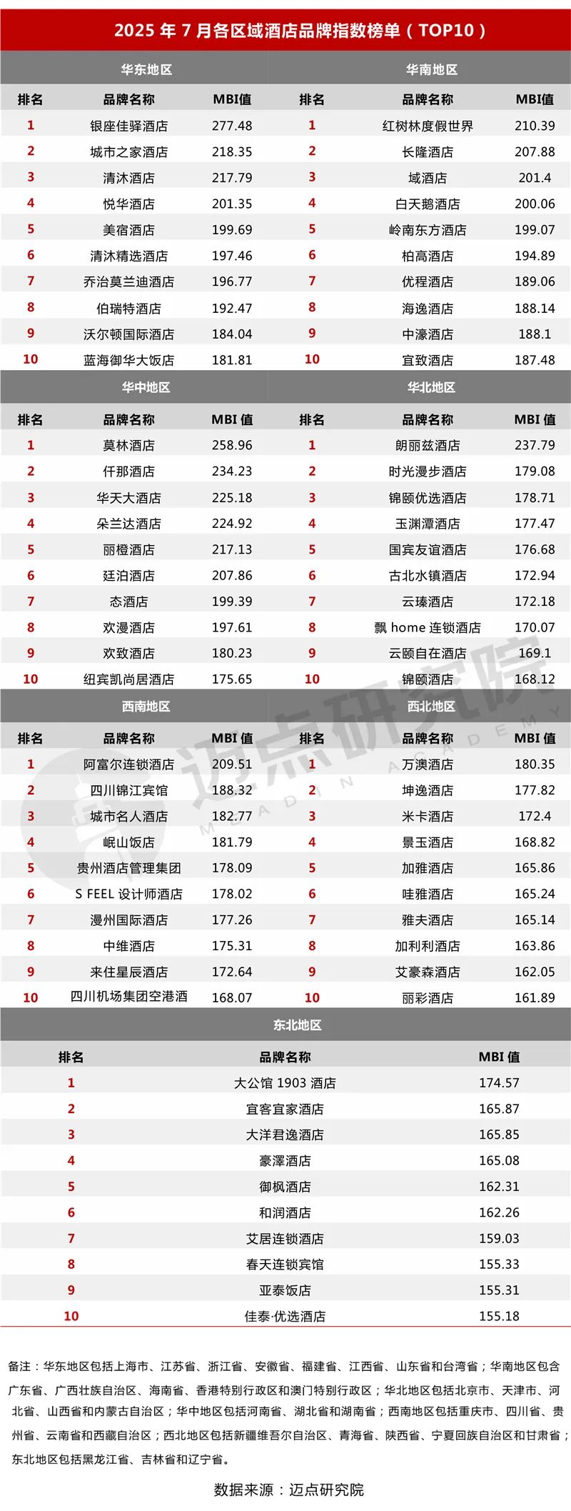 3、区域分布上,西北地区成为唯一正增长区域(+0.11%),在整体市场降温背景下展现强劲韧性。华中地区TOP10品牌指数均值领跑全国,其TOP10榜单中莫林酒店(258.96)、仟那酒店(234.23)等本土品牌表现突出。反观其他区域,西南地区降幅最大(-1.77%),华北(-1.03%)和华中(-1.22%)紧随其后,市场传播热度出现季节性回调。