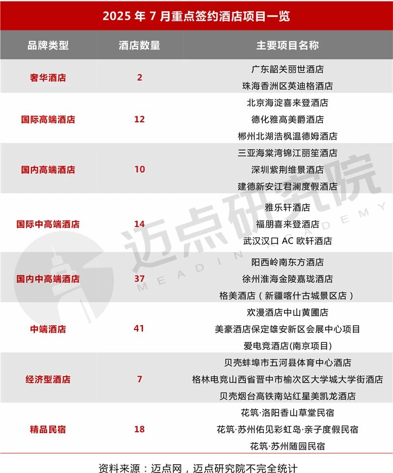 据迈点研究院不完全统计,2025年7月新签约酒店项目共计141家。奢华酒店签约2家,国际高端酒店签约12家,国内高端酒店签约10家,国际中高端酒店签约14家,国内中高端酒店签约37家,中端酒店41家,经济型酒店7家,精品民宿18家。