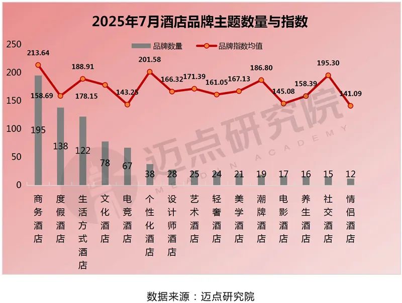 品牌指数均值涨幅情况:商务酒店(+5.09%)、度假酒店(+2.43%)、生活方式酒店(+3.23%)、文化酒店(+4.68%)、电竞酒店(+5.93%)、个性化酒店(+3.43%)、设计师酒店(+5.25%)、艺术酒店(+4.10%)、轻奢酒店(+2.70%)、美学酒店(+5.35%)、潮牌酒店(+5.42%)、电影酒店(-4.08%)、养生酒店(+13.33%)、社交酒店(+6.45%)、情侣酒店(+8.30%)。7月多数主题酒店品牌指数均值呈现正向增长态势,仅电影酒店出现-4.08%的环比下降。从涨幅来看,养生酒店表现尤为亮眼,以+13.33%的显著涨幅领跑所有主题酒店,反映出消费者对健康养生类住宿需求的关注度持续攀升,相关品牌的市场传播效果突出。整体而言,7月主题酒店市场呈现出差异化增长格局,健康、社交、个性化等相关主题表现活跃,市场细分优势进一步凸显。