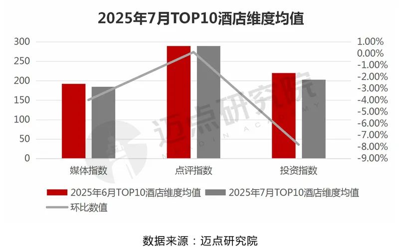 根据迈点研究院的最新数据,7月,TOP10酒店媒体指数和投资指数呈下降态势,点评指数微幅增长,投资指数均值环比下降7.81%,仅希尔顿欢朋酒店实现7.30%的正向增长,整体反映出7月酒店行业投资热度减弱。