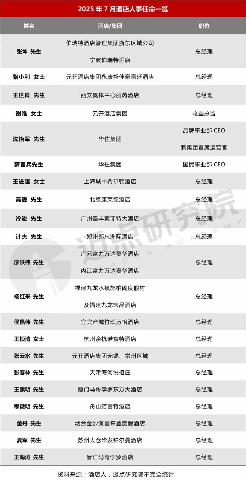 据迈点研究院不完全统计,2025年7月共有21位酒店高管履新,其中涉及华住集团、丽笙酒店集团、希尔顿酒店集团、洲际酒店集团、万豪国际集团等多个酒店集团。
