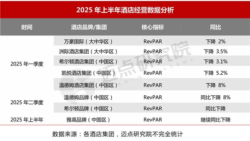 在消费需求结构性调整、行业竞争加剧的大背景下,2025年上半年酒店行业经营数据呈现出复杂态势。从国际酒店集团在大中华区的表现来看,多个品牌的每间可供房收入(RevPAR)出现同比下滑。