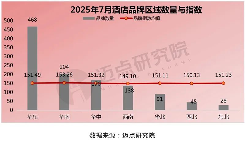 品牌指数均值涨幅情况:华东(-0.47%)、华南(-0.69%)、华中(-1.22%)、西南(-1.77%)、华北(-1.03%)、西北(+0.11%)、东北(-0.54%)。7月多数区域出现品牌指数的环比下降,仅西北地区实现微弱正向增长,涨幅为+0.11%。从下降幅度来看,西南地区降幅最为明显,达-1.77%;华中地区和华北地区紧随其后,分别以-1.22%和-1.03%的降幅位列降幅前列,反映出这些区域的酒店品牌传播热度有所降温,市场活跃度受到一定影响。
