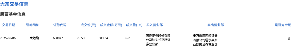 8月6日,大地熊大宗交易成交13.62万股,成交额389.34万元,占当日总成交额的2.83%,成交价28.59元,较市场收盘价31.9元折价10.38%。