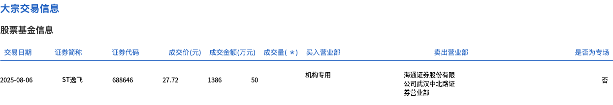 8月6日,ST逸飞大宗交易成交50万股,成交额1386万元,占当日总成交额的25.08%,成交价27.72元,较市场收盘价28.58元折价3.01%。