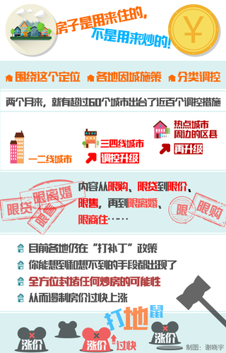 政府一再强调:房子是用来住的,不是用来炒的!围绕这个定位,各地因城施策、分类调控,两个月来,就有超过60个城市出台了近百个调控措施,不只是一二线,连三四线甚至热点城市周边的区县也加入进来,内容从限购、限贷到限价、限售,再到限离婚、限商住等等,目前各地仍在“打补丁”,你能想到和想不到的手段都出现了,全方位封堵任何炒房的可能性,从而遏制房价过快上涨。
