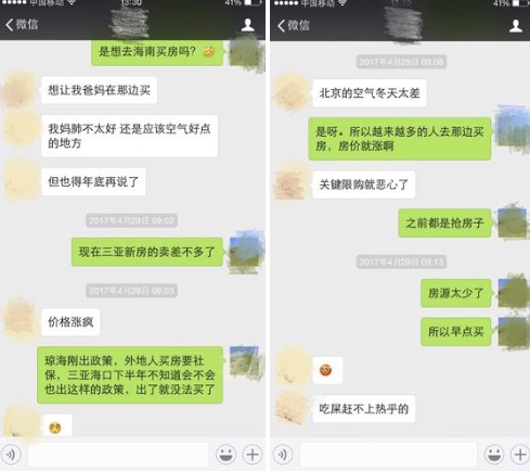 拿最近“大热”的海南来说吧,这不,出台海南全省范围内的限购政策后,海口和三亚的“补丁”政策说来就来了! “五一”前,点金君跟一位想在海南买房的北京朋友的微信对话是这样的↓