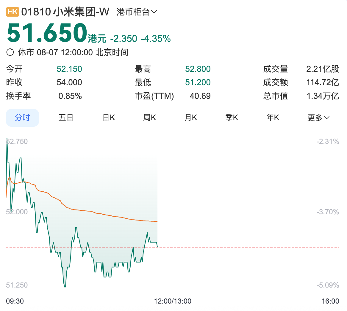 8月7日,小米集团-W(1810.HK)盘中一度跌超5%,股价创近两个月新低。截至午间收盘,小米集团跌4.35%,报51.65港元。