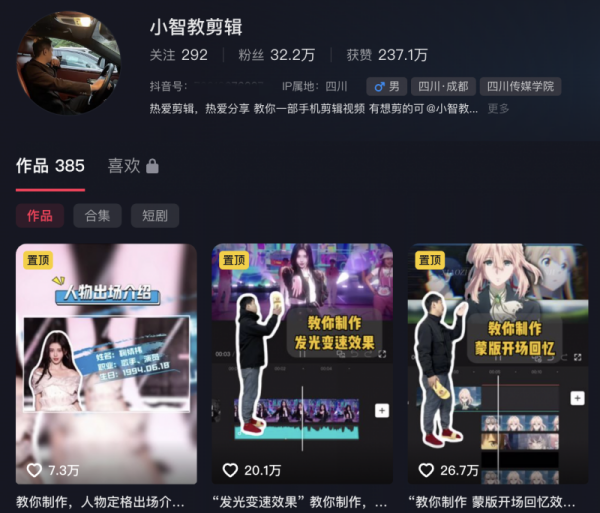 王星程的职业转型颇具戏剧性。出生于医学世家的他,因为不想重复父母的职业,在大二那年放弃了就读的医学专业。做一个自媒体成为他“看看外面世界”的方式和窗口。2019 年,在运营一个口播为主的抖音号时,他接触到了剪映。很快,简单好上手的剪映专业版成为他的主要剪辑工具。相比其他软件,剪辑专业版既有复合片段、多机位编辑、钢笔蒙版等电脑端剪辑的独有功能,也支持自动识别字幕等低门槛操作,不是科班出身的王星程也很快自学出师。今年29岁的他如今已经成为一名专业剪辑师,他的创作方向也调整为用短视频教剪辑,账号 "小智教剪辑" 全网粉丝超百万。