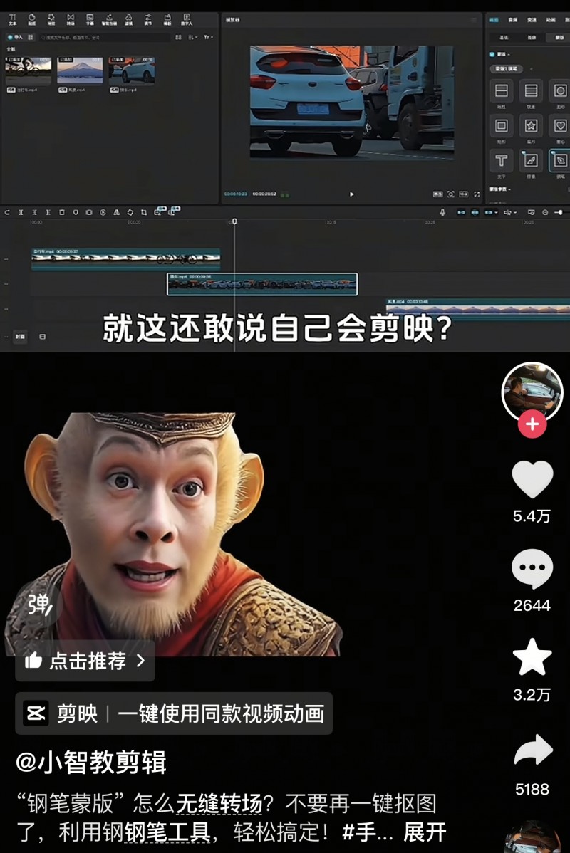 日常创作中,剪映的几大功能被王星程高频调用。其中用于精细化抠图的钢笔蒙版,更是他制作爆款视频的 “秘密武器”。今年 4 月 26 日,王星程借助该功能制作了一条孙悟空主题的教程,在多平台引发热潮,很快就能在各大平台看到孙悟空在教大家剪视频了。而 AI 配音功能则让他告别了 找工具的繁琐,直接在软件内完成语音生成与口型匹配,单条视频制作时间缩短近 30%。