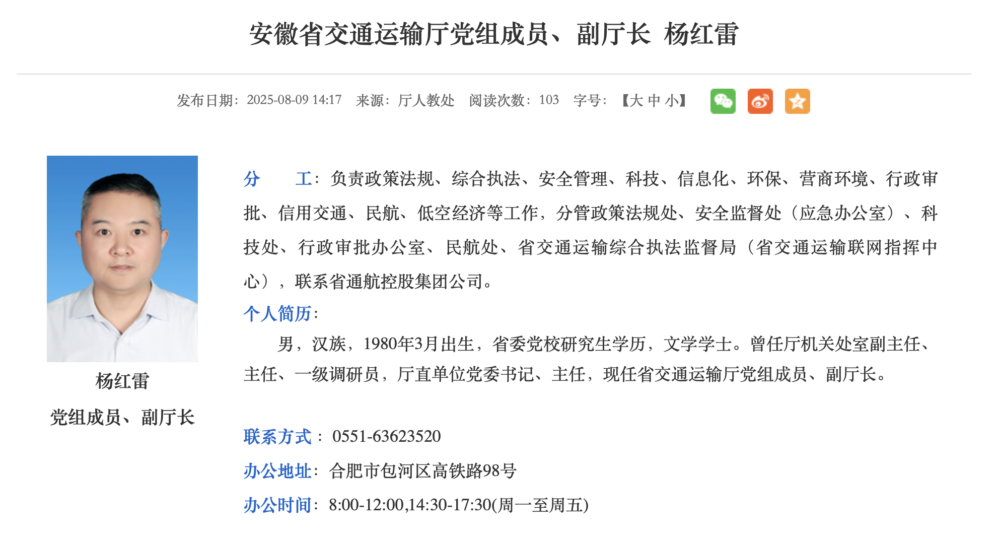 据安徽省交通运输厅官网消息,该网站“机构领导”一栏8月9日更新后显示,杨红雷已任安徽省交通运输厅党组成员、副厅长。