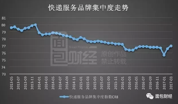 不过,2016年中国几大快递巨头上市后,快递行业的集中度出现了上升。据国家邮政局数据,2017年3月份,快递服务品牌集中度指数为77,创下近一年来新高。下图为面包财经根据国家邮政局数据绘制的快递服务品牌集中度走势: