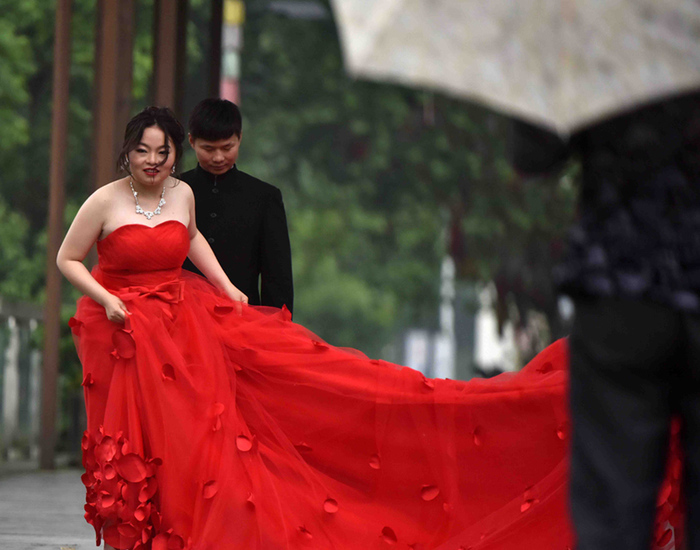 20. 2016年5月12日,四川汶川县映秀镇,汶川地震期间曾经担任志愿者的尹春龙在地震发生8周年这天带着未婚妻来到映秀,拍摄婚纱照。