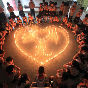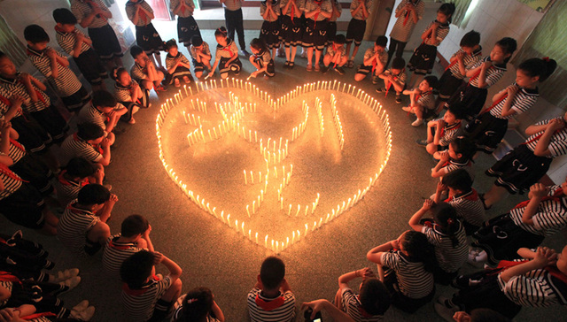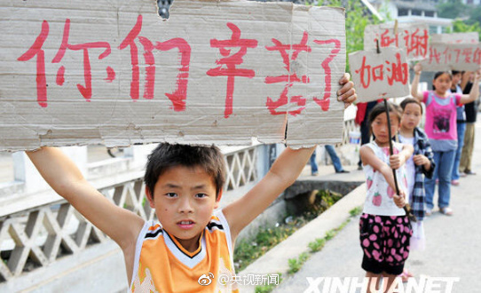 8. 汶川地震后,一群灾区的孩子举着写有“你们辛苦了”字样的感恩牌向路过的救灾队伍致谢。