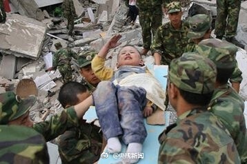 7. 一位战士抱着刚刚获救的孩子。地震救援期间还有很多类似感人事迹。