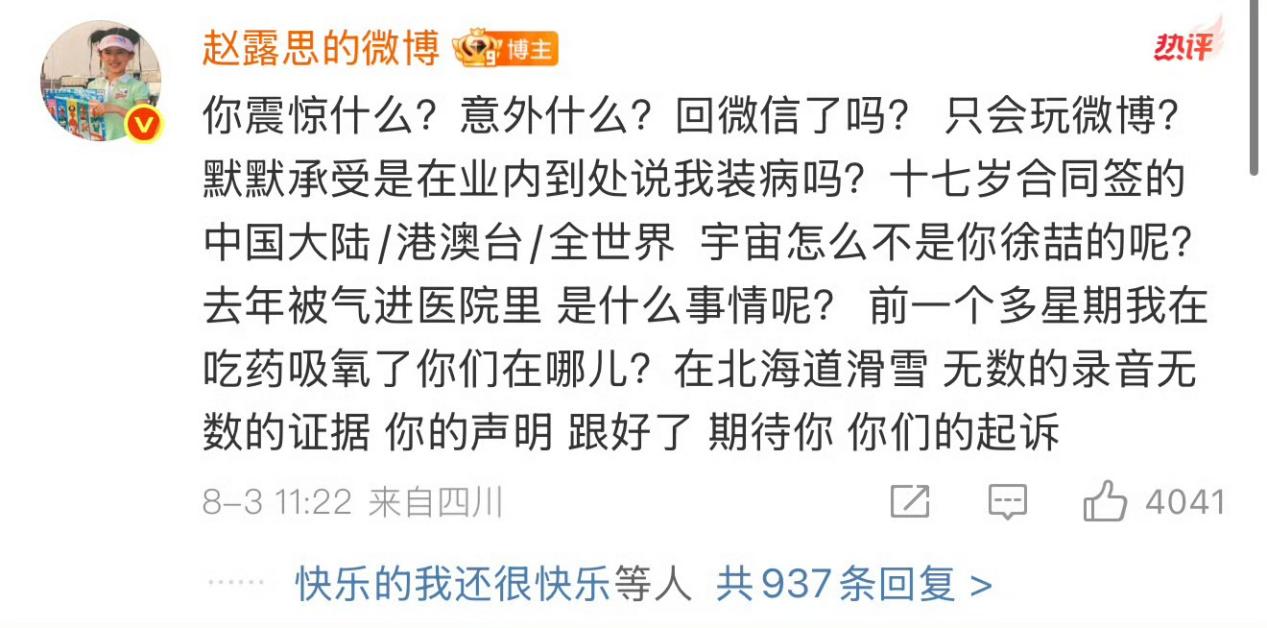 8月2日下午五点,赵露思在微博艾特其经纪公司银河酷娱传媒,这一意义模糊的举动迅速引发了网友的讨论,并登上微博热搜TOP1。事后赵露思表示这是想让公司能与她正面沟通,但等待无果后她选择了发文声讨。