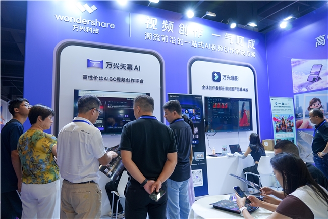 8月8日至11日,万兴天幕2.0携其原生应用——移动端AIGC应用新品万兴天幕AI APP、Web端AI视频创作平台万兴天幕创作广场(tomoviee.cn),以及融合其AI能力的视频剪辑神器万兴喵影,又重磅亮相国内唯一国字号动漫展中国国际影视动漫版权保护和贸易博览会(简称“漫博会”),与迪士尼、宝可梦、哈利波特与泡泡玛特、奶龙、三体等国内外顶级IP同台,向行业呈现了其前沿的一站式AI视频解决方案,再度引发文创领域热议。万兴科技展台也凭借潮流前沿的AI视频创作展示及趣味互动玩法,吸引了大量观众驻足体验,现场人气爆棚、互动氛围热烈,成为漫博会一大核心亮点。