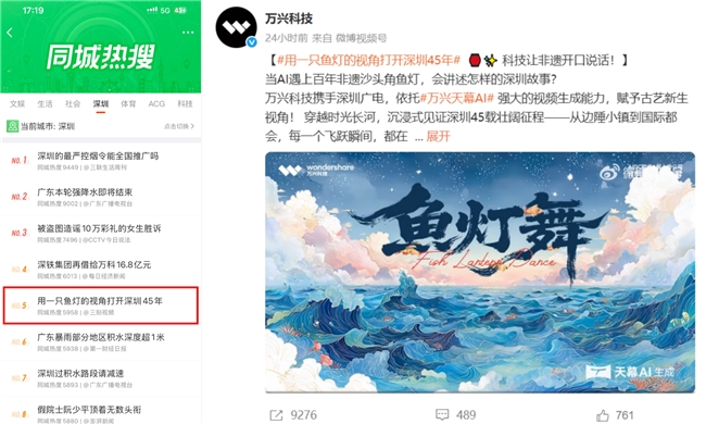 近日,AIGC软件上市公司万兴科技(300624.SZ)旗下万兴天幕音视频多媒体大模型2.0爆火,其驱动生成的深圳渔业非遗AI宣传片《AI耀鹏城 鱼灯舞星河》引爆社交网络,相关微博话题登上深圳热搜榜Top5。