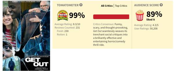 《逃出绝命镇》自上映之后,烂番茄新鲜度一度达到100%,甚至到今天都仍保持着99%的新鲜度——