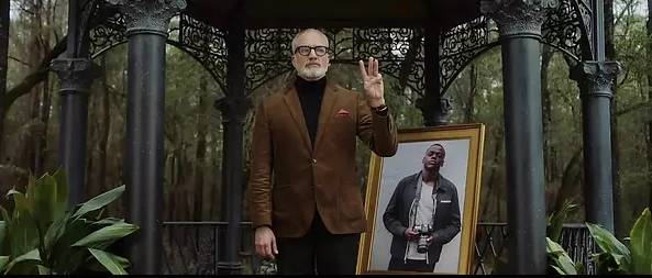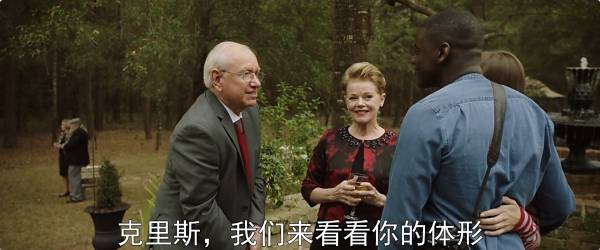 在这个派对之上,克里斯发现了一个他所认识的人——整个派对上唯一的黑人。但是奇怪的是,这个人的穿着打扮完全变了,而且很亲密地挽着一个白人大妈,更重要的是,他好像完全不认识克里斯了——