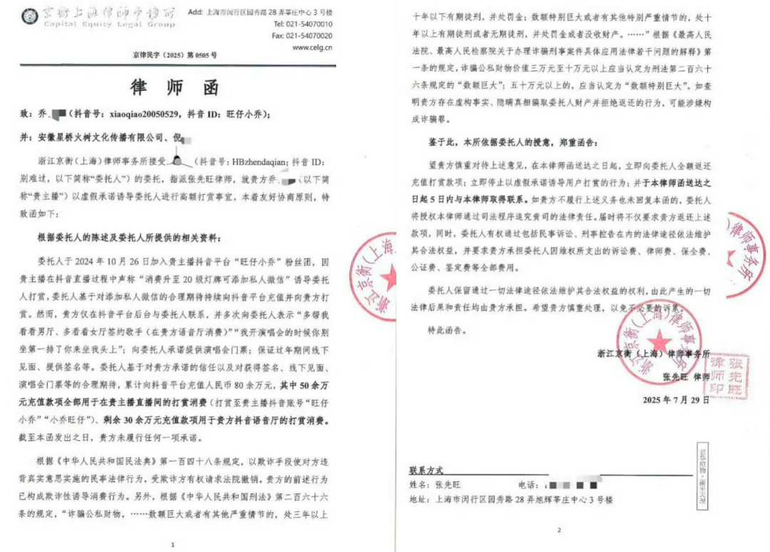 这也是旺仔小乔眼下的局面。她先是因蒙面、版权等争议不得不叫停个人演唱会,紧接着又收到粉丝“别难过”发来的律师函。该粉丝控诉,旺仔小乔曾以“我开演唱会的时候你别坐第一排了,你来坐我头上”等话术诱导打赏,要求其全款退还。外界揣测,是不是旺仔小乔曾经的承诺无法兑现,“榜一大哥”急眼了。