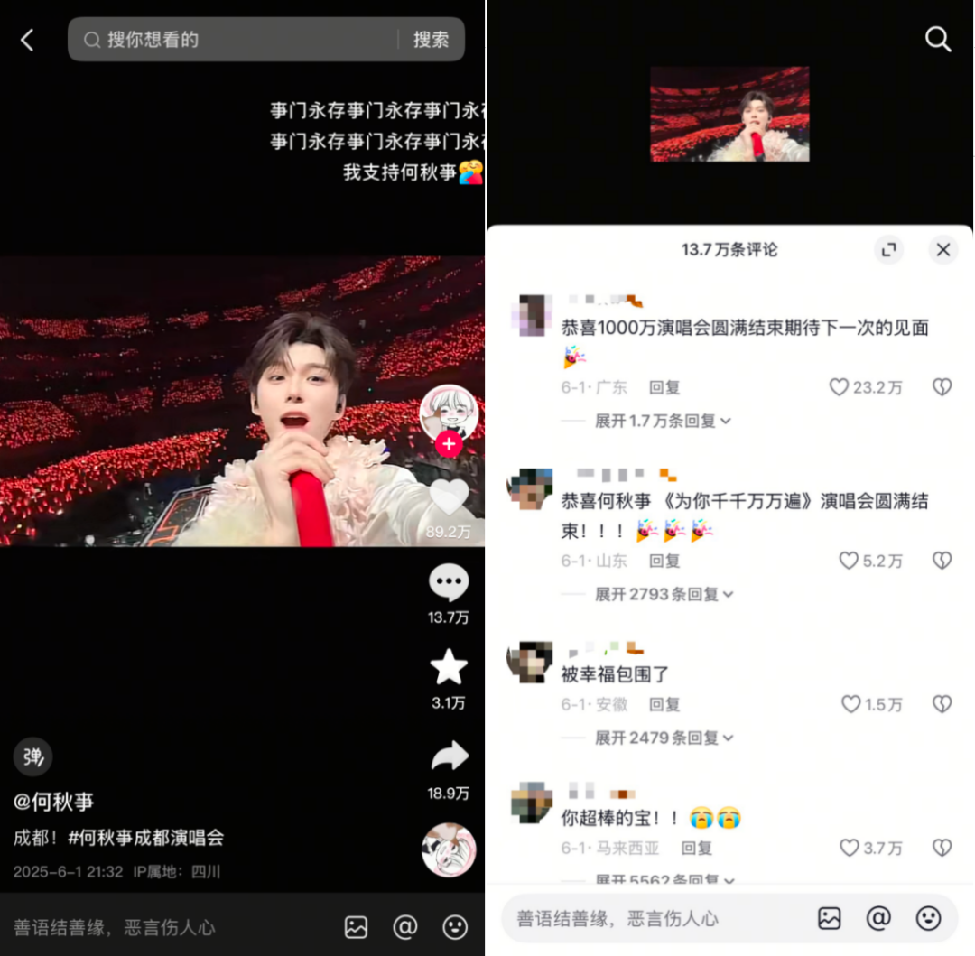 对中间商来说,在粉丝接受范围内,定价越高、售票越多,自然赚得越多。事实上,何秋亊的演唱会在预热、售票阶段,粉丝都未表现出明显异议。他们还在演唱会结束后发出大量真情实感的小作文。对票价体系产生强烈不满的反而是路人粉、乃至纯路人。