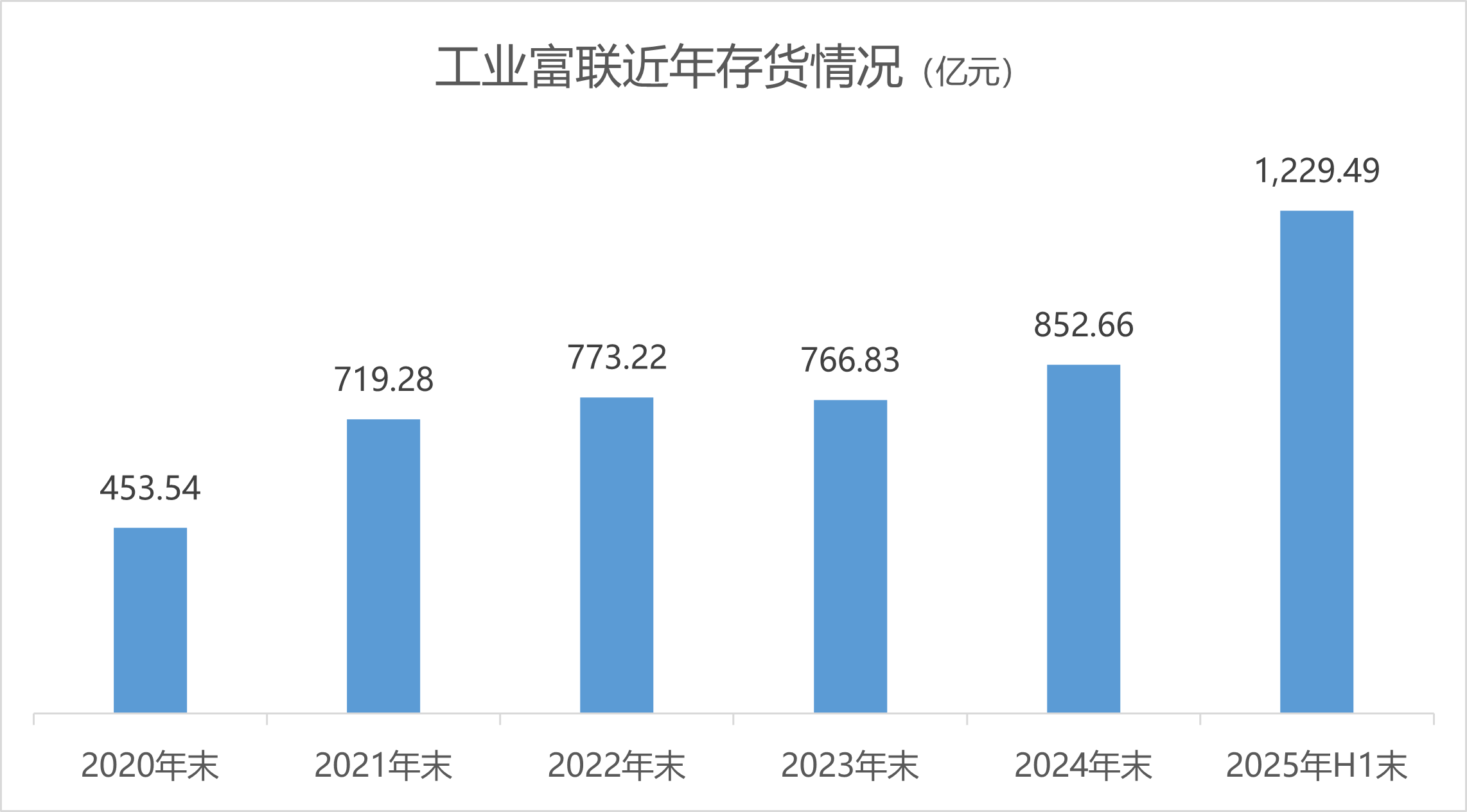 截至二季度末,工业富联账面存货高达1,229.49亿元,较一季度末又增加了约30亿元,较2024年末更是增加376.83亿元。公司2021年末至2023年末存货均为700多亿元。
