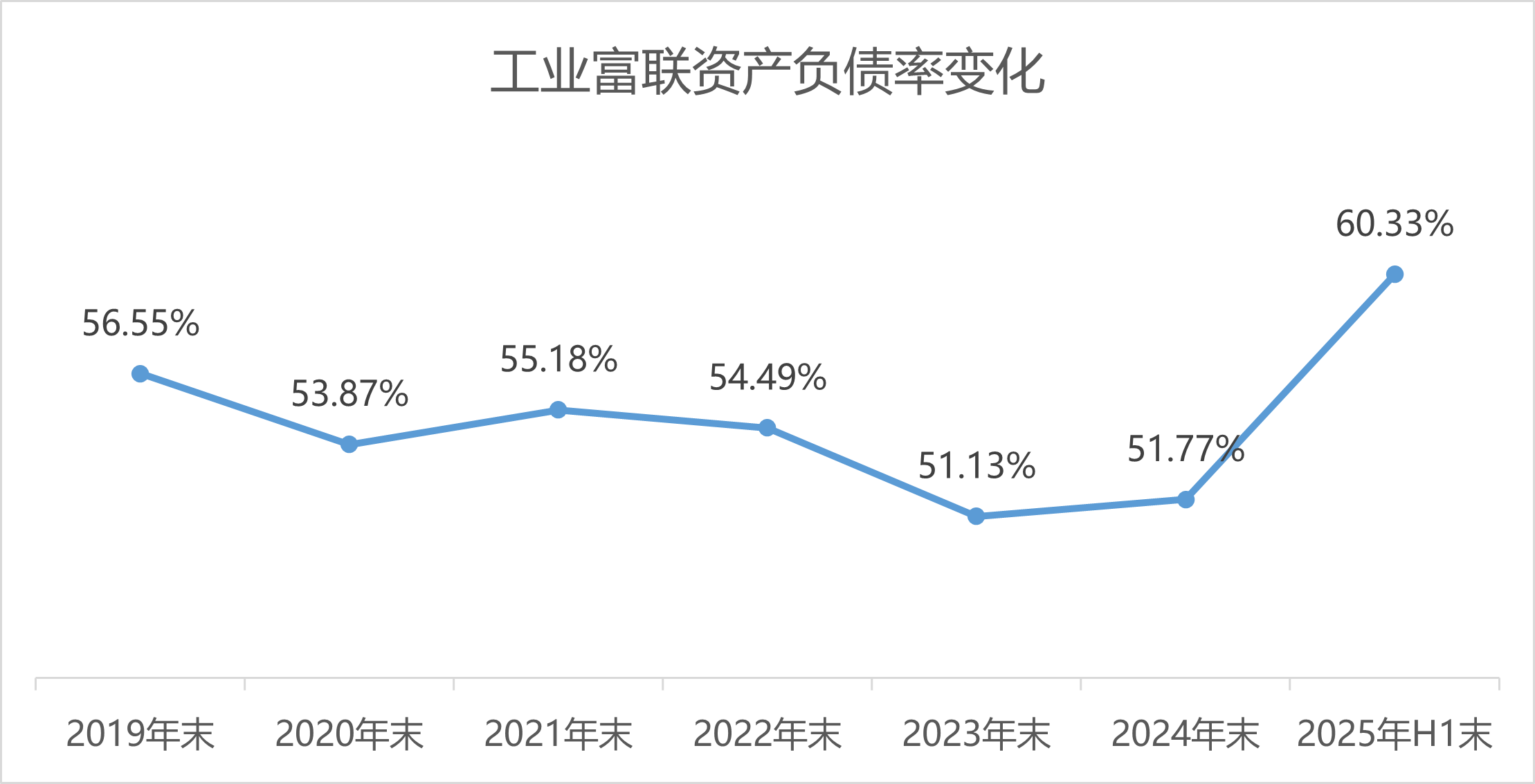 此外,界面新闻记者还发现,工业富联在货币资金超过900亿元的同时短期借款激增,出现“存贷双高”异象。截至上半年末,公司资产负债率更是一举突破60%,创近六年新高。