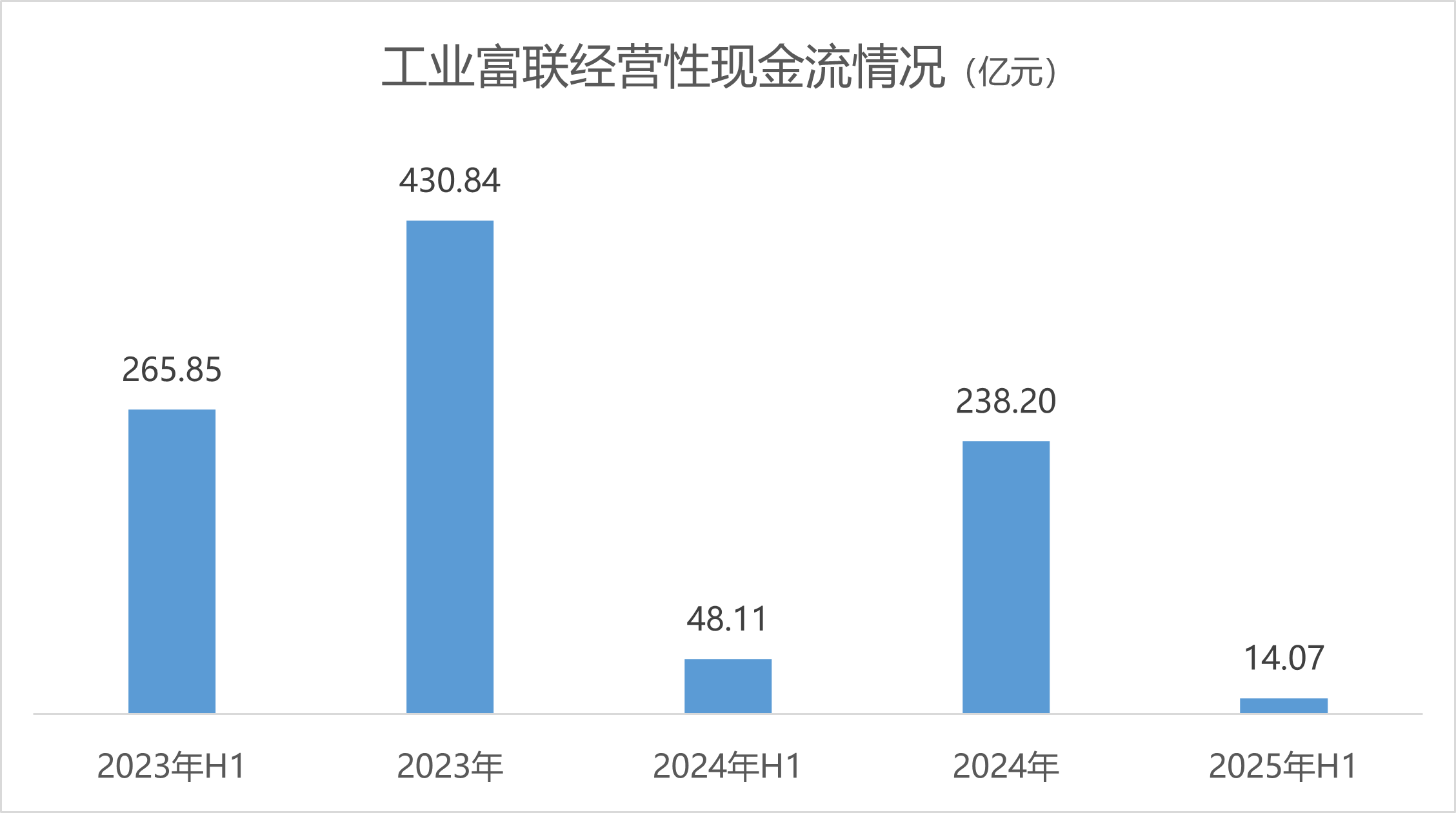 工业富联上半年经营活动产生的现金流量净额仅14.07亿元,同比大降约70%。2023年和2024年同期分别为265.85亿元和48.11亿元。