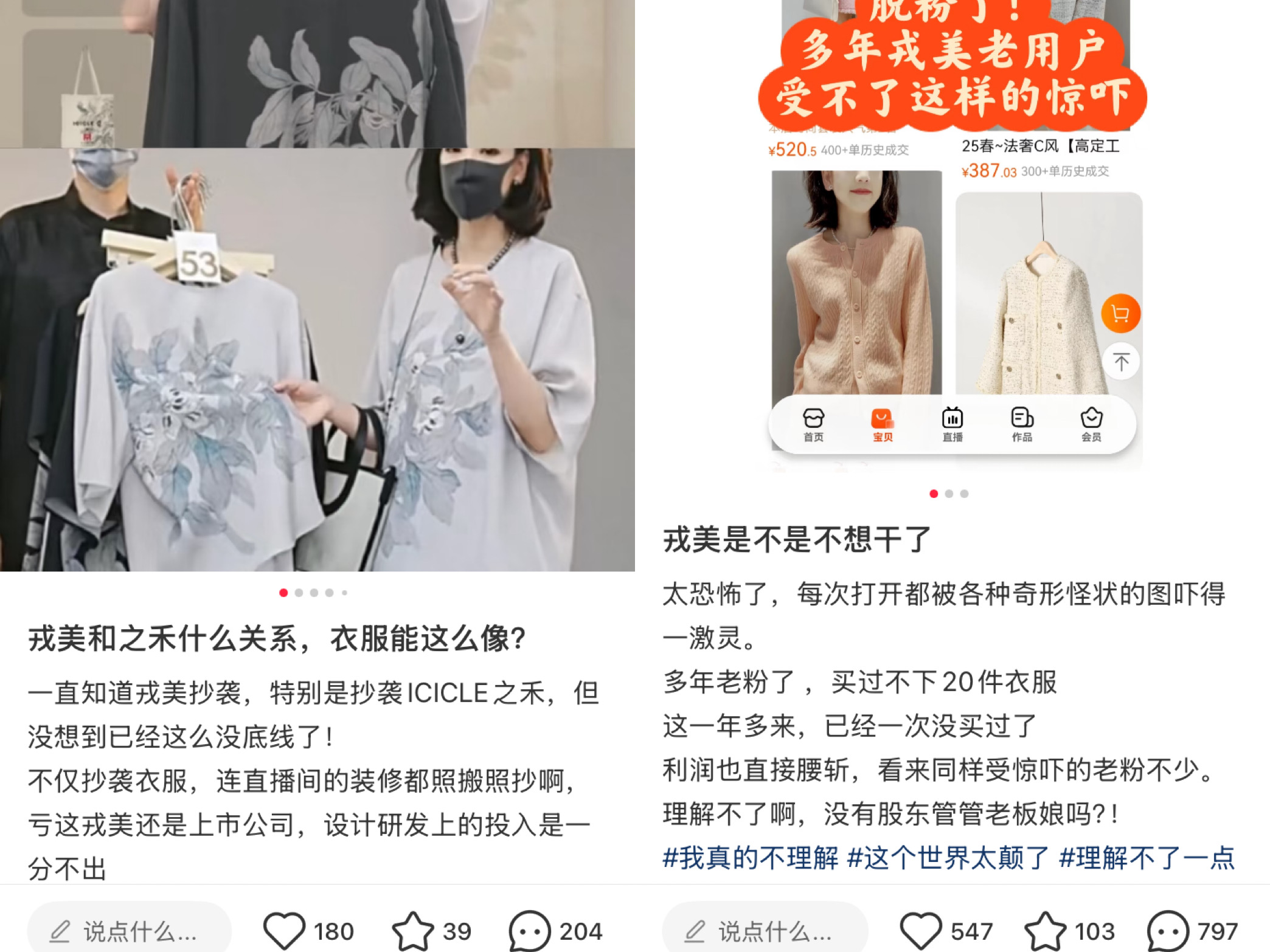 之禾早在2016年就起诉戎美侵害其作品著作权,法院最终判定戎美侵权。今年7月,设计师女装品牌Fabrique也宣布其诉戎美著作权侵权及不正当竞争纠纷案获得二审胜诉。根据判决,戎美也在其官方公众号及淘宝店铺首页刊登了相关声明。
