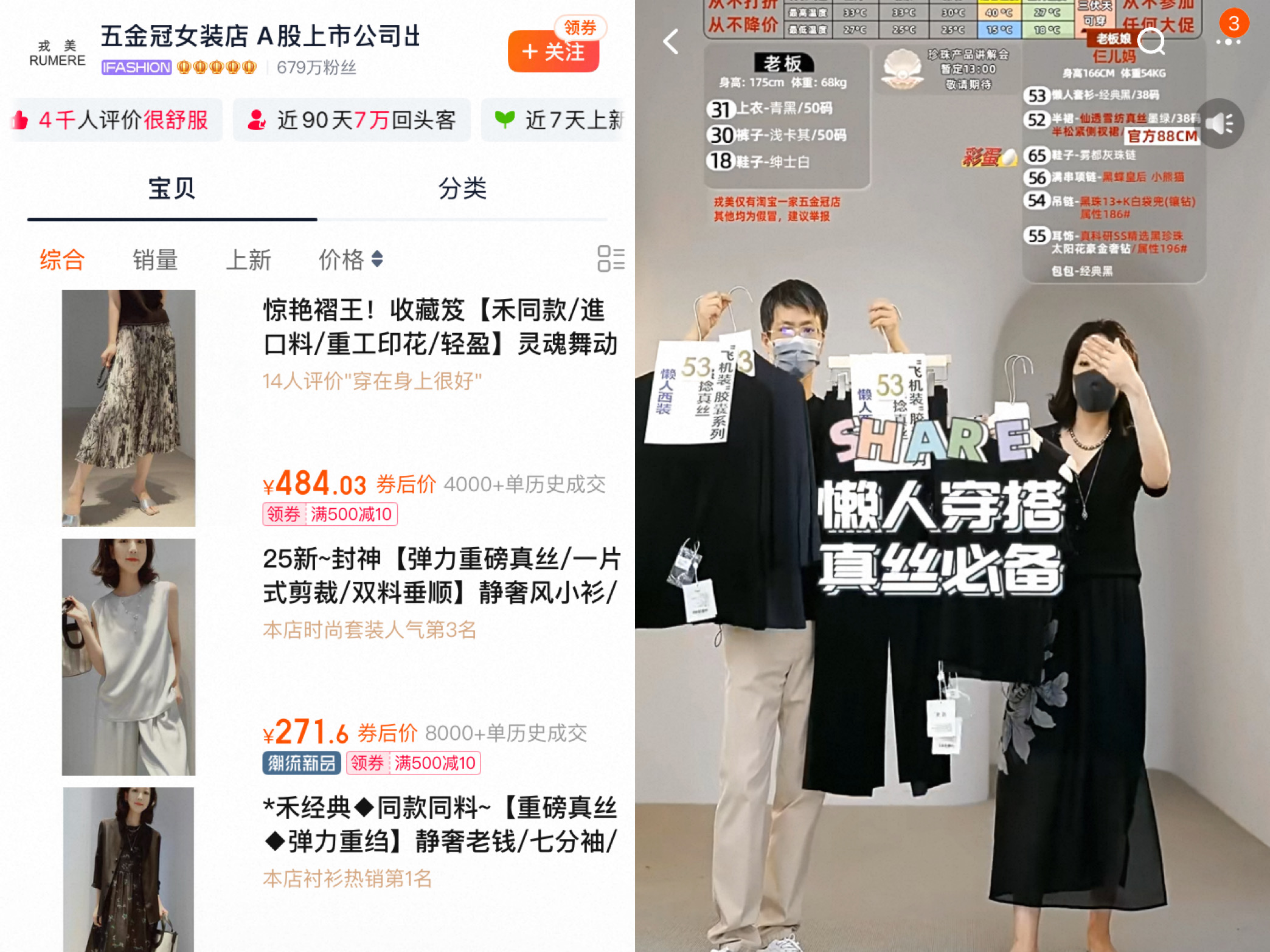 虽然戎美股份常提及外部环境的压力,但作为起步较早的淘系女装,它迄今仍在淘系平台占据头部位置。为公司贡献99.9%收入的主要淘宝店铺“戎美五金冠女装店 A股上市公司出品”为19年老店,积累了679万粉丝。