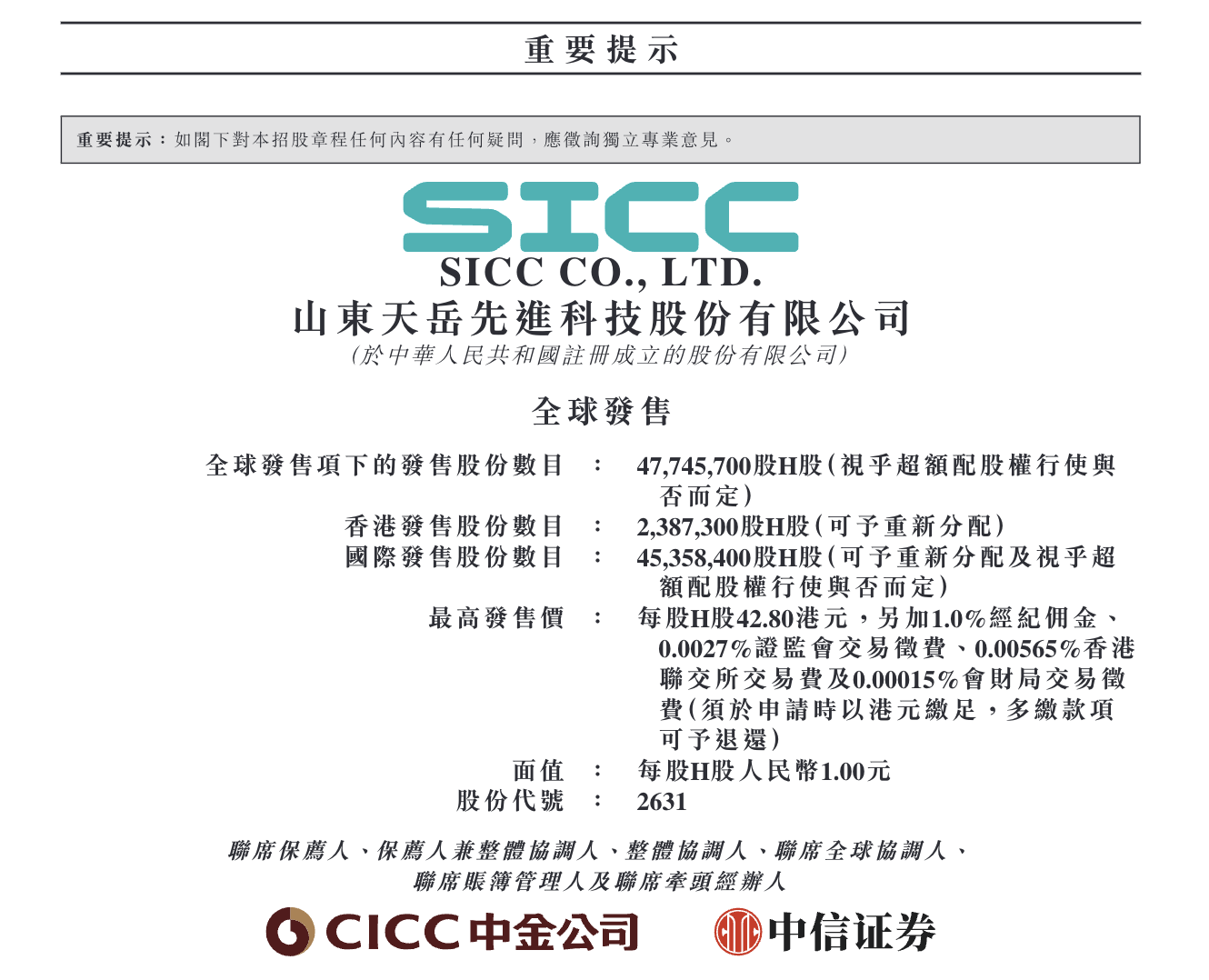 据悉,天岳先进本次港股发售采用“上限定价”机制,发售价不超过每股42.80港元,每手买卖单位100股,入场费约4323.17港元。