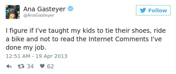 我发现如果我能教会孩子系鞋带,骑车,以及不要去读网络上的评论,我的任务也就完成了。
