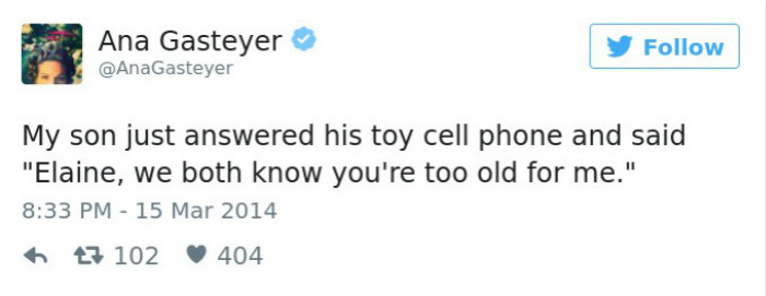 我儿子刚刚拿着玩具手机说:“伊琳,我们都知道,对我来说你的年纪太大了。”