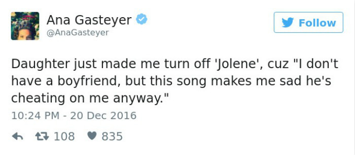 我女儿让我不要再听《Jolene》(一首关于劈腿的歌)了,因为(她说)“我现在还没有男朋友,但是这首歌让我感觉很伤心,我未来的男朋友会想尽办法欺骗我”。