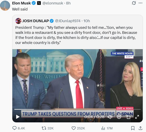 在马斯克11日的最新发文中,他转发了特朗普关于整顿华盛顿治安的视频讲话,并评论“说得好”。特朗普在视频中称他的父亲曾告诉他,如果看到一家餐馆的大门是脏的,就不要进去,“因为大门脏,厨房就脏,如果我们的首都脏,整个国家也是脏的。”
