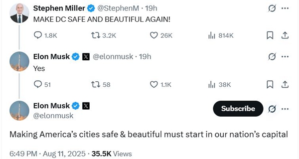 早些时候,马斯克回复了白宫副幕僚长斯蒂芬·米勒关于特朗普向华盛顿特区部署国民警卫队的贴文,评论称“让美国城市安全美丽必须从我们的首都开始”。
