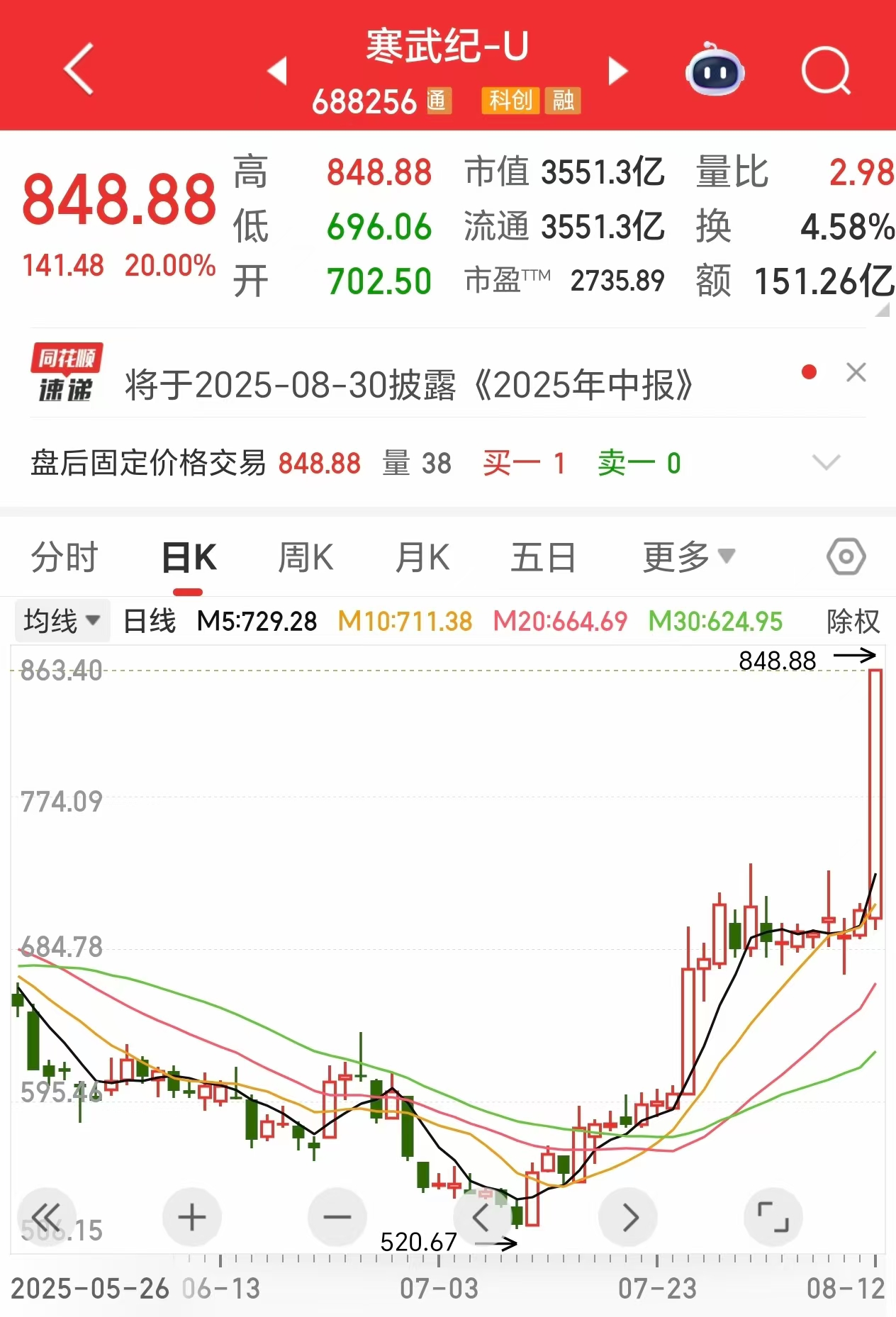 8月12日收盘,寒武纪(688256.SH)涨停,报848.88元/股,创历史新高,市值超过3551亿元。