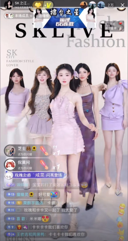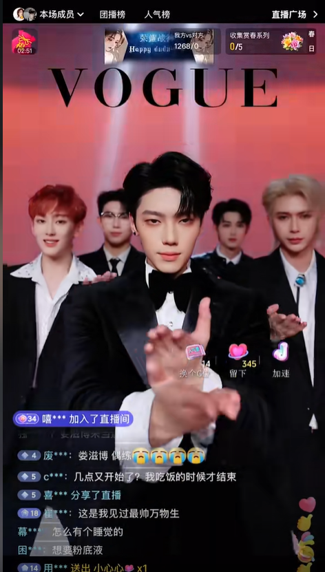 在表演类型上,除了常规的男团女团,古风、二次元、Hip-Pop等类型也纷纷出现。而在传统的“打PK”之外,各种主题和互动玩法也衍生出来,比如玩游戏、演短剧,直播带货……团播的一片红海,也吸引了B站、小红书等新平台纷纷加入。
