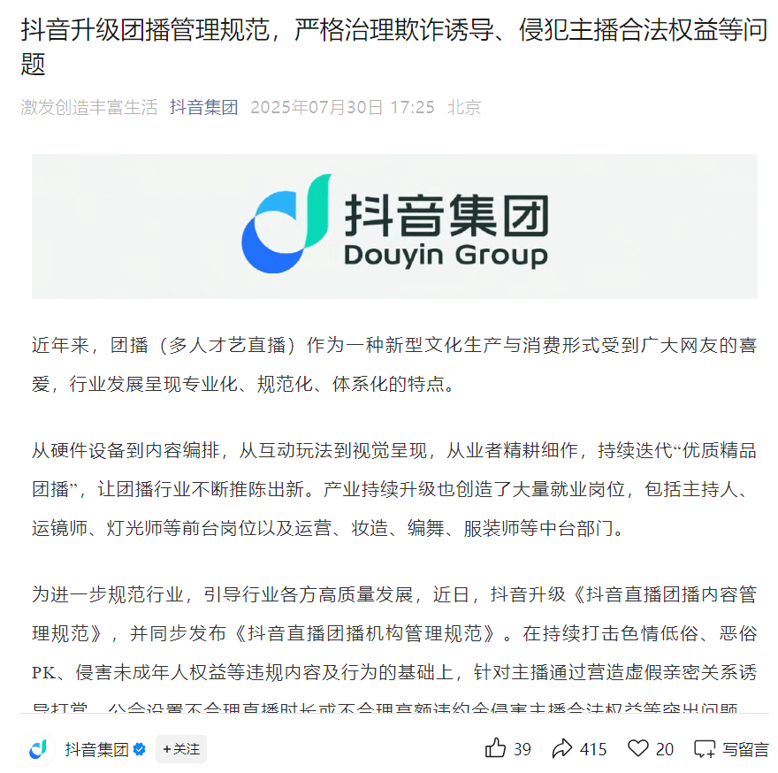 以普遍市场原理发展,要规避同质化,就势必会有各种“旁逸斜出”的尝试,而要让团播作为一种产业平稳落地,势必需要在这一时期尤其注重合规管理。就在7月30日,抖音刚刚宣布升级《抖音直播团播内容管理规范》,并同步发布《抖音直播团播机构管理规范》。抖音直播相关负责人介绍,此次管理规范升级后,将进一步加强对主播在直播场景外侵害用户权益、公会设置合约陷阱侵害主播权益等不当行为的治理。