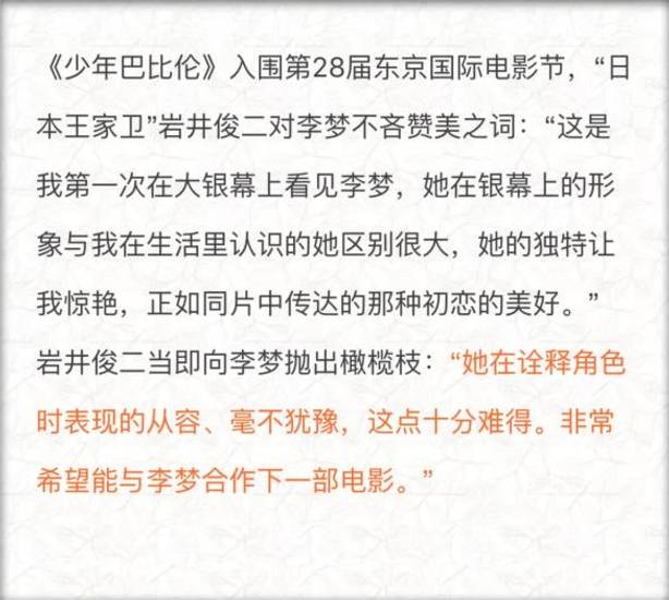 这样有的放矢的表现,在本片中还有很多。而李梦的演技也获得了岩井俊二的赞扬。